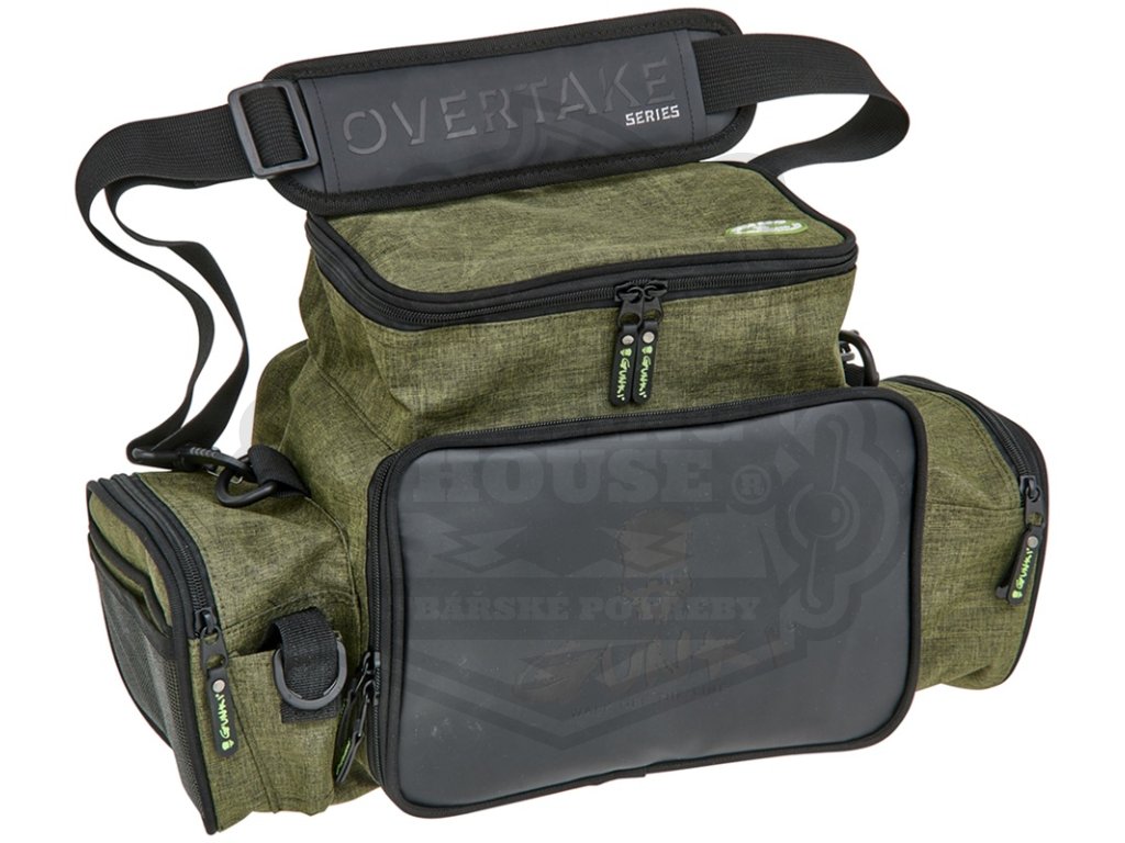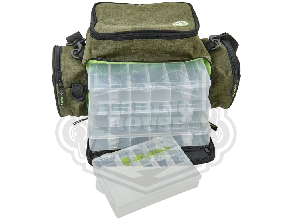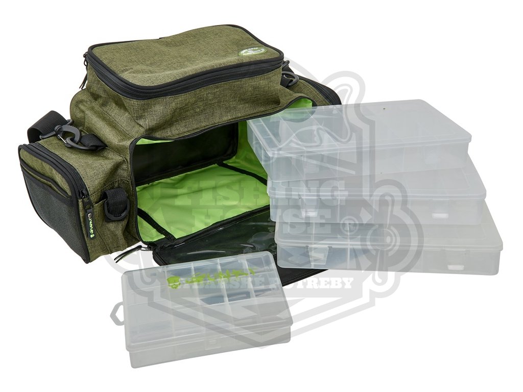 Taška pro uskladnění všeho potřebného na přívlač. Taška obsahuje hlavní komoru, tři vnější kapsy na zip, dvě síťové kapsy a držák kleští. Součástí hlavní komory jsou tři krabičky na nástrahy o rozměrech 27,5×19,5×4,5 cm. Horní komora navíc obsahuje krabičku na nástrahy 20×13,5×4 cm, která je velmi praktická pro uspořádání drobného příslušenství. Po stranách se nachází řada „vedlejších“ kapes (na zip, síťovaných, průhledných nebo na kleště). Pevná odolná tkanina je doplněná o kvalitní zipy. To vše v Gunki designu. Součástí je odnímatelný ramenní popruh. Rozměry: 28x20x18 cm.