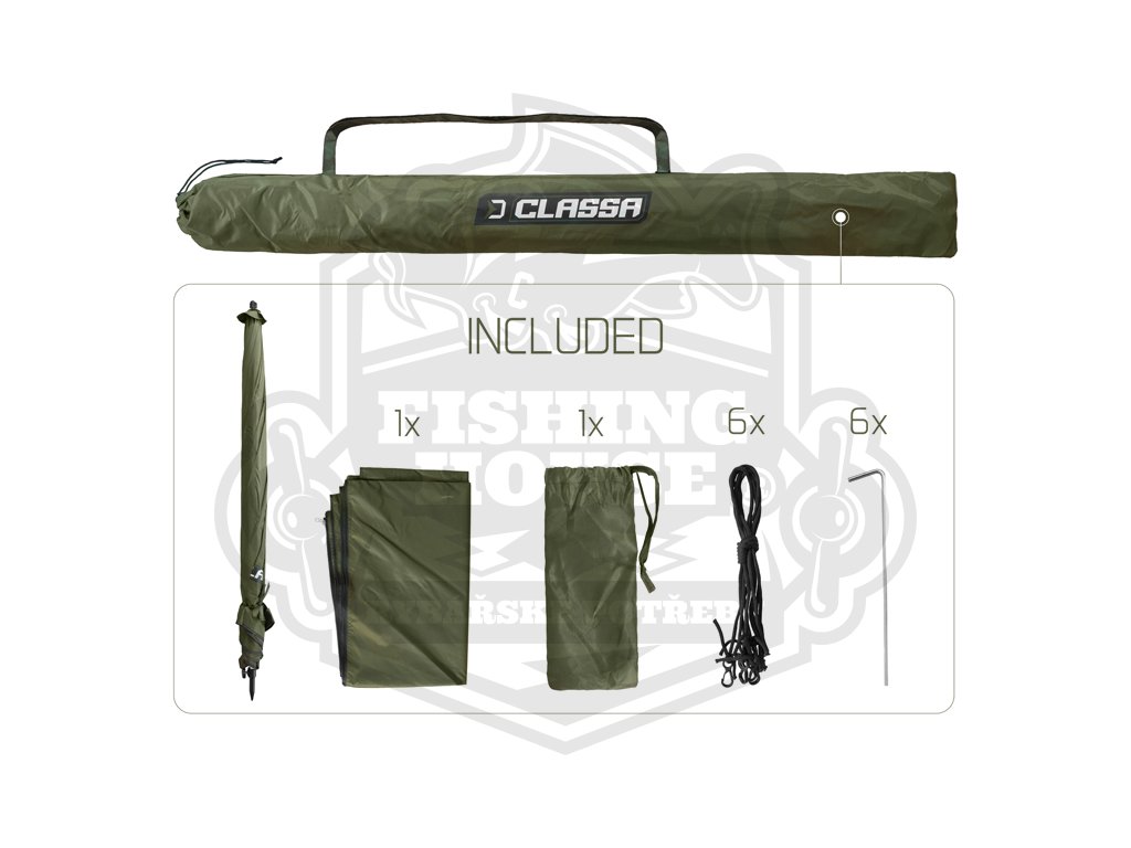 Švy deštníku jsou za horka kompletně podlepeny voděodolnou páskou pro zajištění 100% nepromokavosti i při větším dešti. Pro lepší stabilitu ve větru je deštník CLASSA vybaven čtyřmi ukotvovacími lany. K dispozici je boční prodloužená stěna, která se upevňuje pomocí kvalitního zipu kolem kopule. Spodní část bočnice je osazena úchyty pro upevnění k zemi pomocí zajišťovacích kolíků (kolíky jsou součástí balení).