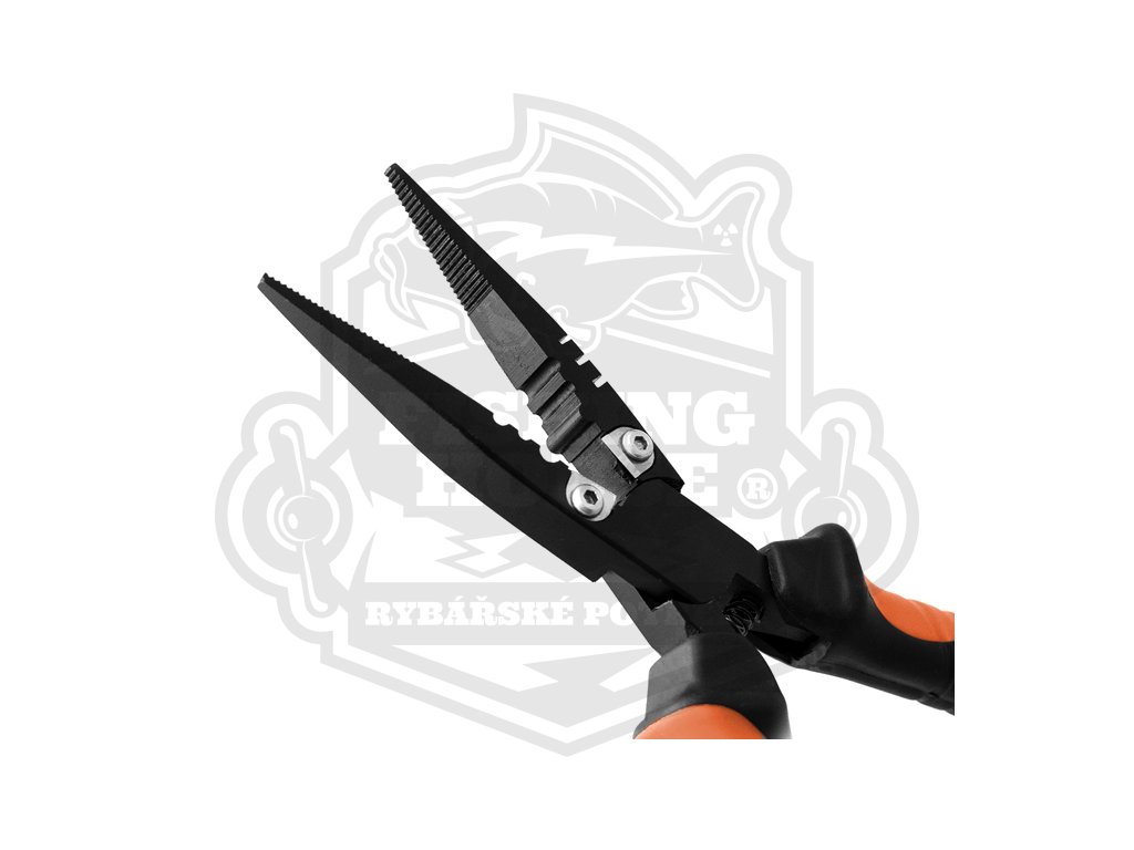Jejich délka je 18 cm. Vnitřní plocha kleští poskytuje dostatek gripu pro uchopení i velkých dvojháčků a trojháčků. Na čelistech se nachází také integrovaná část určená pro krimpování, s celkovou šířkou 9 mm. Ramena kleští jsou vybaveny pružinou, která je udržuje otevřené a připravené pro okamžitou manipulaci. Jsou vyrobeny z oceli s vysokým podílem uhlíku a jejich obě rukojeti jsou vybaveny plastem oranžové a černé barvy, které jsou dobře viditelné za každých podmínek a dobře padnou do ruky. Na obou ramenech rukojeti se nacházejí otvory na provlečení šňůrky. S našimi kleštěmi Multi+Cut dokážete od nynějška rybu rychle a bezpečně zbavit zaseknutých háčků.