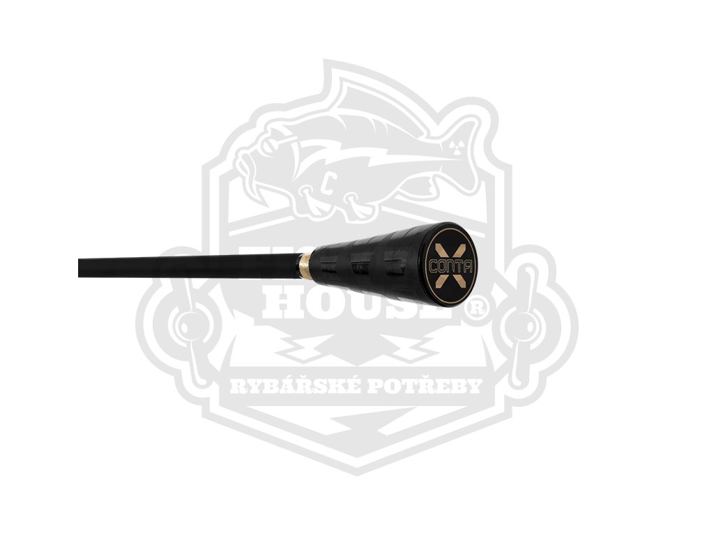 Blank je vyroben z 30T karbonu a přesně z tohoto důvodu je ContaX tak lehký a má dostatečnou sílu pro daleké a přesné nahazování. Prut je osazen jednostopými zirkoniovými očky od Seaguide s výjimečně tvrdou a odolnou výplní, které jsou nově rozloženy takv aby optimalizovaly rozmístění síly na prutu. Sedlo prutu je kombinováno z karbonu a kvalitního lesklého plastu, je tedy velmi lehké a má ergonomický tvar, takže se komfortně drží v ruce i během několikahodinového lovu. Spoje jednotlivých dílů jsou nelakované, odlehčené a zpevněné 1K karbonovou punčochou. Rukojeť je naším vlastním návrhem a je rovněž vyrobena z uhlíkových vláken s křížovým vinutím a doplněna černo-zlatou kovovou koncovkou. Povrchová úprava prutu je matná s výrazným zlatým ovinem kolem oček a je doplněna zlatým vinutím nad a pod sedlem navijáku a také nad rukojetí.