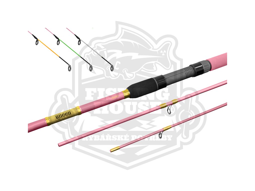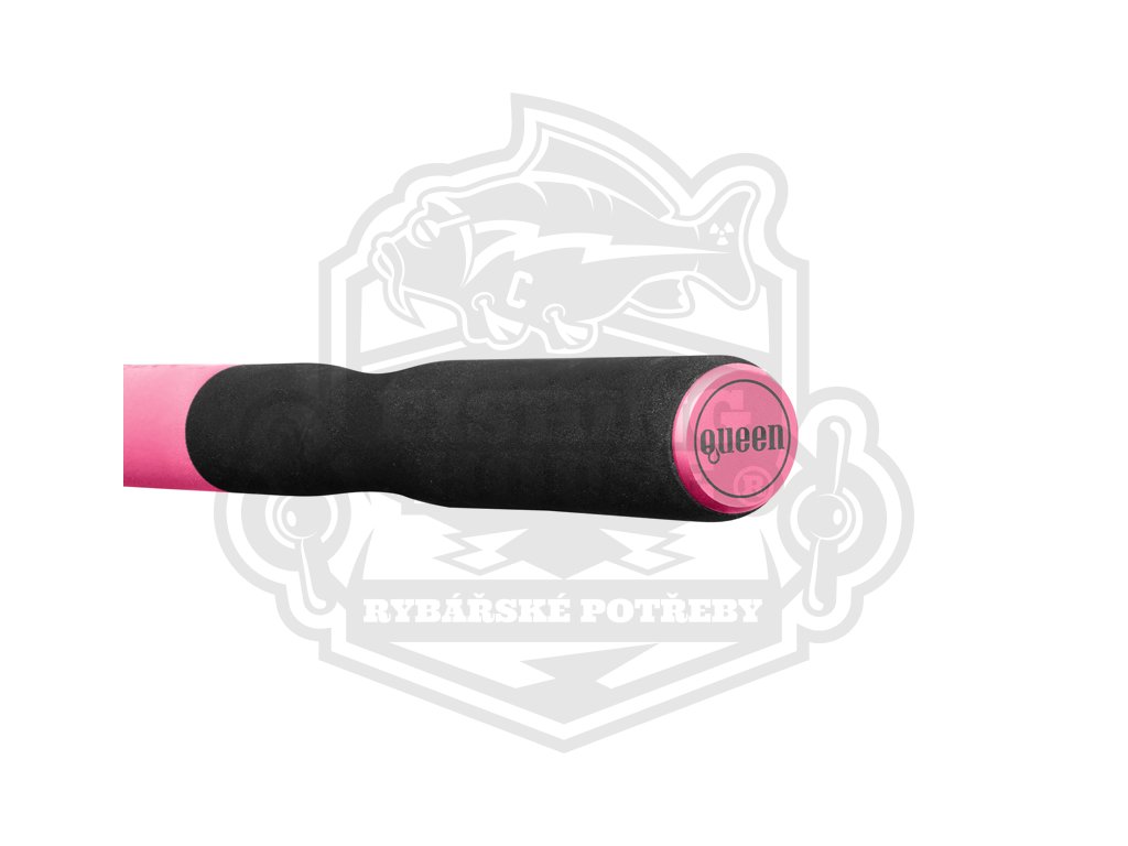 Základem je ověřený štíhlý blank s parabolickou akcí a výbornými mechanickými vlastnostmi. Celá rukojeť je potažena EVA pěnou, která je velmi příjemná na dotek i ve studeném zimním počasí. Navíc je navržena v barevné dvojkombinaci růžové s černou, což vytváří vizuálně velmi pěkný prvek. Rukojeť je v jednom místě ergonomicky zúžená a ukončena je vkusným hliníkovým prvkem růžové barvy s logem. Díky citlivým špičkám, které jsou s prutem dodávány, vám neunikne ani ten nejjemnější záběr od malých ryb. Blank je osazen kvalitními a lehkými SiC očky, které nevytvářejí žádné nadbytečné tření a odpor při průchodu vlasce. V základu je prut dodáván s jednou karbonovou (Heavy) a dvěma CarbonGlass (Light, Medium) špičkami. Feederové pruty Queen nebudou jen ozdobou každé rybářky, ale také plnohodnotným pomocníkem při lovu.