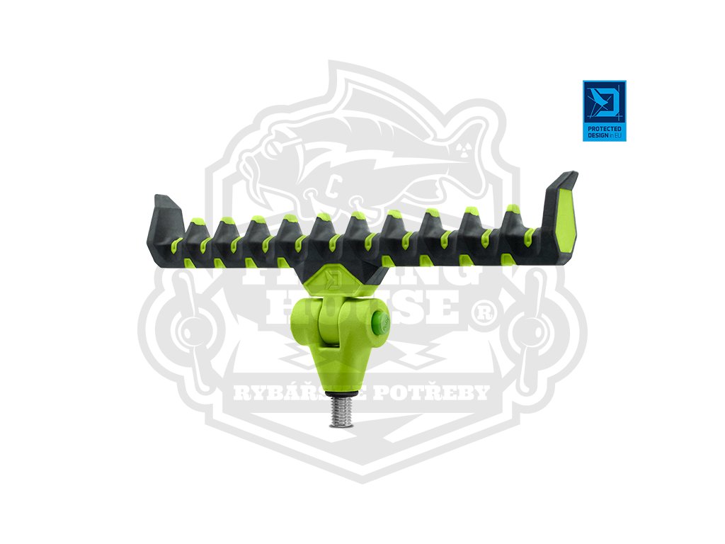 Prémiový feederový držák vysoké kvality v barvách inovativní feederové série Delphin Reaxe. Jak už název napovídá, model Flexi je plně naklápětelný pomocí jednoduchého mačkacího mechanismu, kterým umožňuje přizpůsobit se různému sklonu prutu, například během lovu na řece, ve větru nebo z nerovného terénu. Díky dostatečné šířce umožňuje upravit polohu prutu po nahození a tak docílit optimálního ohybu špičky bez potřeby nadměrného navíjení vlasce zpět na cívku navijáku. Držák je vyroben z odolných materiálů, takže se snadno nepoškodí a nepoškrábe. Jeho speciálně navržený tvar poskytuje dokonalou podporu prutu a zabrání jeho vysmeknutí i při razantních záběrech. Povrch držáku je potažen pogumovaným materiálem, který je extra šetrný k povrchu prutu a chrání jej před poškozením. Univerzální závit umožňuje uchycení na všechna standardní ramena, stojany a vidličky. Na závitové části se nachází gumová podložka, která zamezuje otáčení držáku. Držák Flexi lze použít i pro lov se dvěma pruty.Technické parametry: