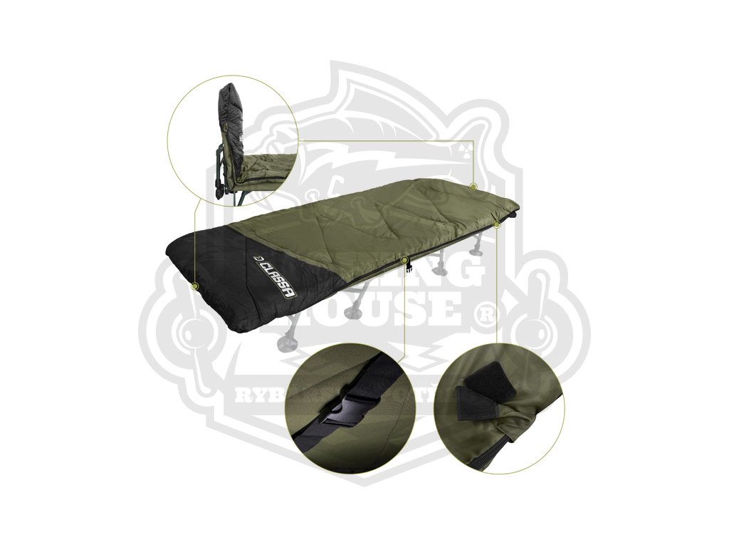 Na obou koncích spacího pytle CLASSA jsou ze spodní strany našity převleky, sloužící k natažení na lehátko. Výhodou je fixační popruh s masivním klipem ve střední části spacího pytle. Díky převlekům v kombinaci s popruhem nebude docházet k nechtěnému kroucení na lehátku. Právě tyto prvky rozhodně nejsou samozřejmostí u spacáků z podobné cenové kategorie a jsou velkou devizou modelu CLASSA.