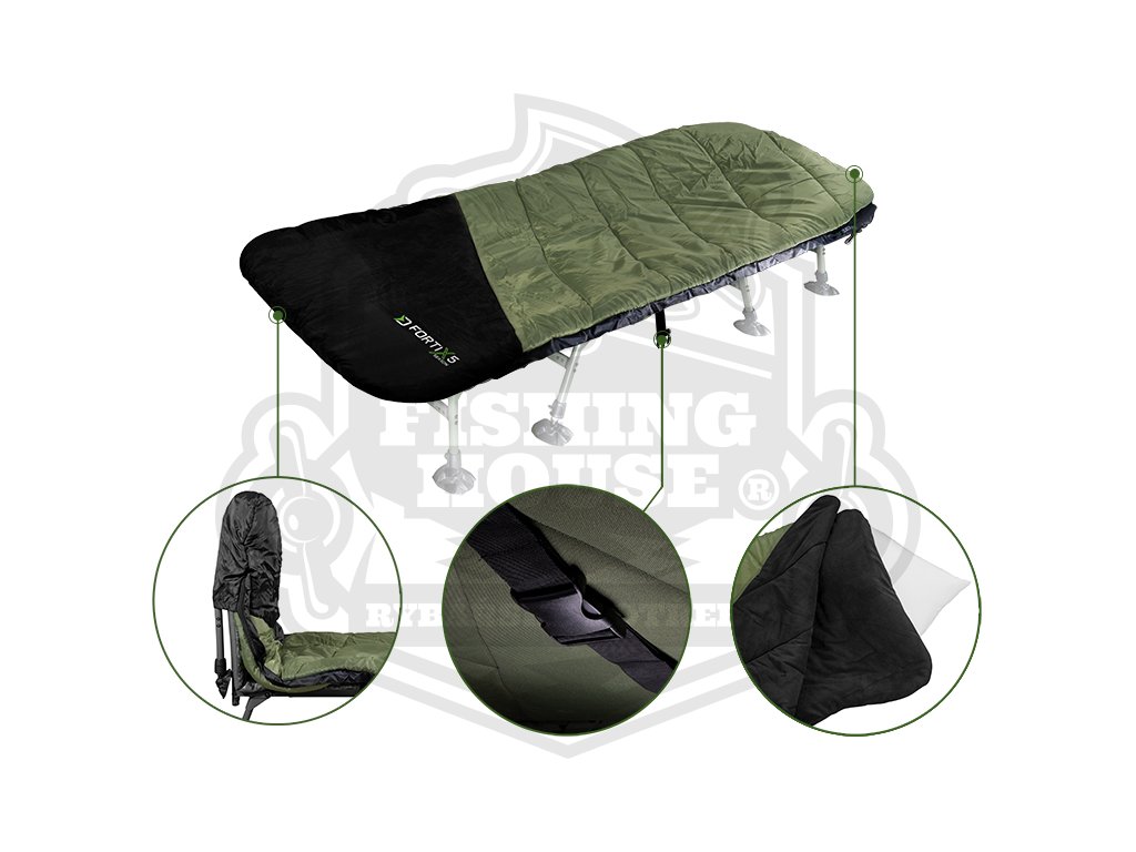 Na obou koncích spacího pytle FORTIX jsou ze spodní strany našity převleky, sloužící k natažení na lehátko. Samozřejmostí je fixační popruh s masivním klipem ve střední části spacího pytle. Díky převlekům v kombinaci s popruhem nebude docházet k nechtěnému kroucení na lehátku.
