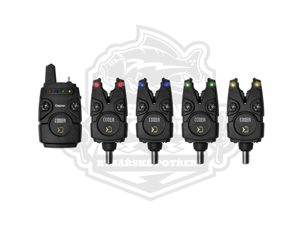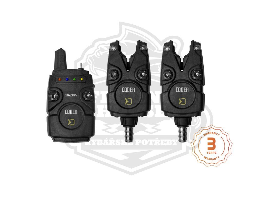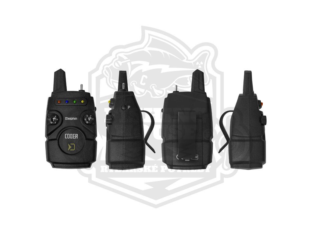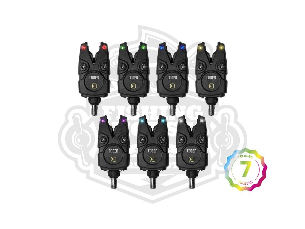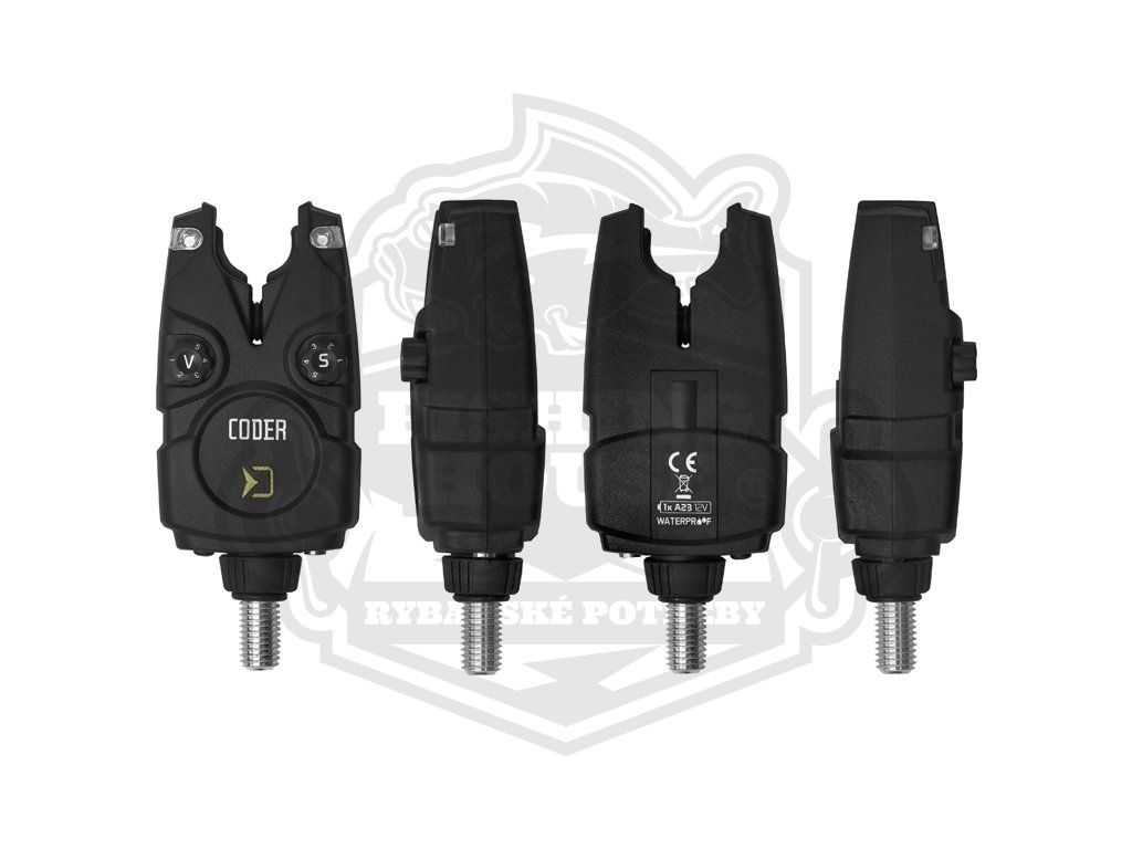 Signalizátor je napájen 1x12V baterií typu LR23A, která disponuje dostatečně dlouhou výdrží. V případě slabé baterie vás signalizátor upozorní krátkým pípnutím. Pomocí spínače "V" je možné vybrat jednu z 5 úrovní hlasitosti, včetně tichého módu. Také si lze navolit požadovaný tón a úroveň citlivosti (v rozmezí 1-9 cm), které mají také 5 různých úrovní. Nespornou devizou signalizátorů ze sady Coder je možnost výběru ze 7 barev signalizační LED diody. Každý si tak vybere svou oblíbenou a pokud zatoužíte po změně, tak si jednoduše zvolíte jinou barvu dle návodu. Na zpětný záběr vás upozorní odlišný tón a po každém záběru se rozsvítí na dobu 15 sekund paměťová dioda. Ve spodní části se nachází vstup pro 2,5 mm konektor pro připojení svítícího indikátoru. Během nočního lovu lze zapnout také poziční diodu.