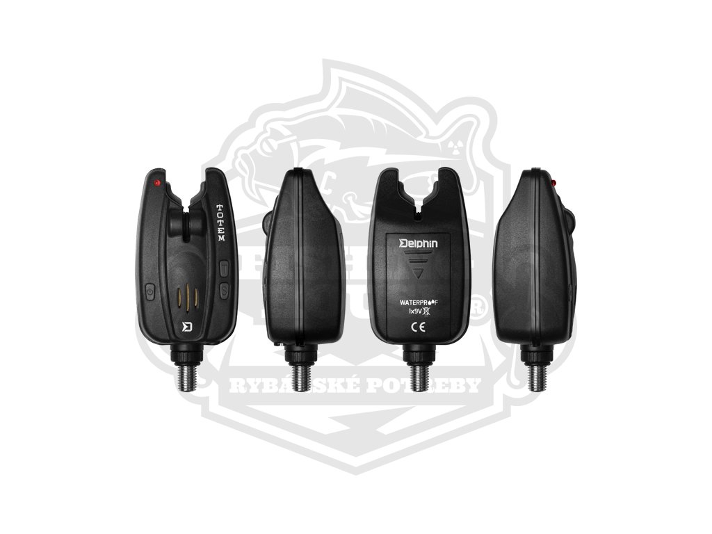 Signalizátor má ultra jasnou LED diodu s velmi dlouhou výdrží. Je napájen 9V baterií, což zajišťuje jeho dlouhou dobu provozu. Dobrou vychytávkou je alarm, který krátkým pípnutím a svícením LED diod upozorní na snížení stavu kapacity baterie pod 5V (rovněž pípne i přijímač). Totem nabízí možnost otestování všech jeho funkcí. Má 4 úrovně hlasitosti včetně tichého režimu, 4 různé tóny a 4 úrovně citlivosti. Ve tmě jistě oceníte možnost zapnutí noční diody. Vstup pro 2,5mm jack umožňuje připojení svítícího signalizátoru záběru. Silné pogumování v části kontaktu prutu se signalizátorem zamezuje poškození prutu. Signalizátor po záběru svítí 15 sekund (také přijímač). Přijímač je napájen 3 kusy AAA baterií. Na zadní straně má umístěný odepínatelný klip pro upevnění například za opasek. Samozřejmostí je tvrdý transportní kufřík pro bezpečný transport a ochranu sady mimo sezónu, tento kufřík pojme sadu až do konfigurace 4+1. Přijímač má 5 úrovní hlasitosti včetně tichého módu a možnost nastavení 4 úrovní tónu. Totem je kvalitní signalizátor se všemi funkcemi, které využijete při rybaření. Noční LED dioda, voděodolný alarm i přijímač či test funkcí s upozorněním na slabé baterie. To je jen pár výjimečných funkcí signalizátoru Delphin Totem.